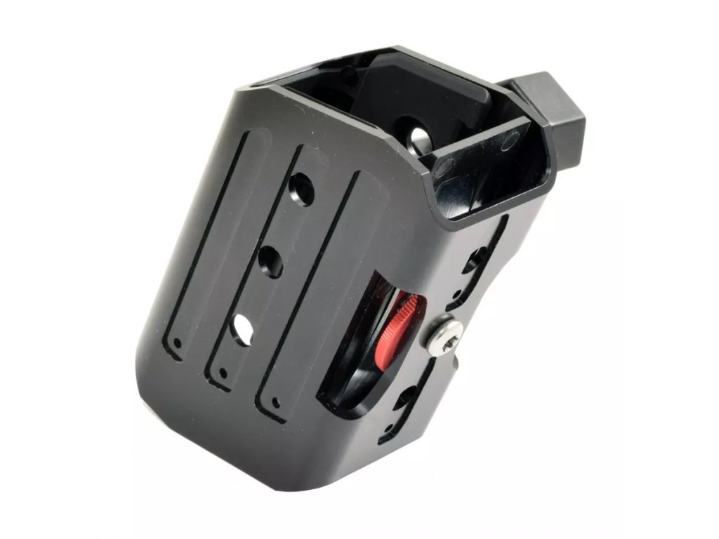 The ball joint is held in the aluminum belt hanger using a pressure coupling with a large T25 Torx M6 Screw. This offers a totally secure lock up and the option to make minute adjustments to the pouch’s angle and tilt.