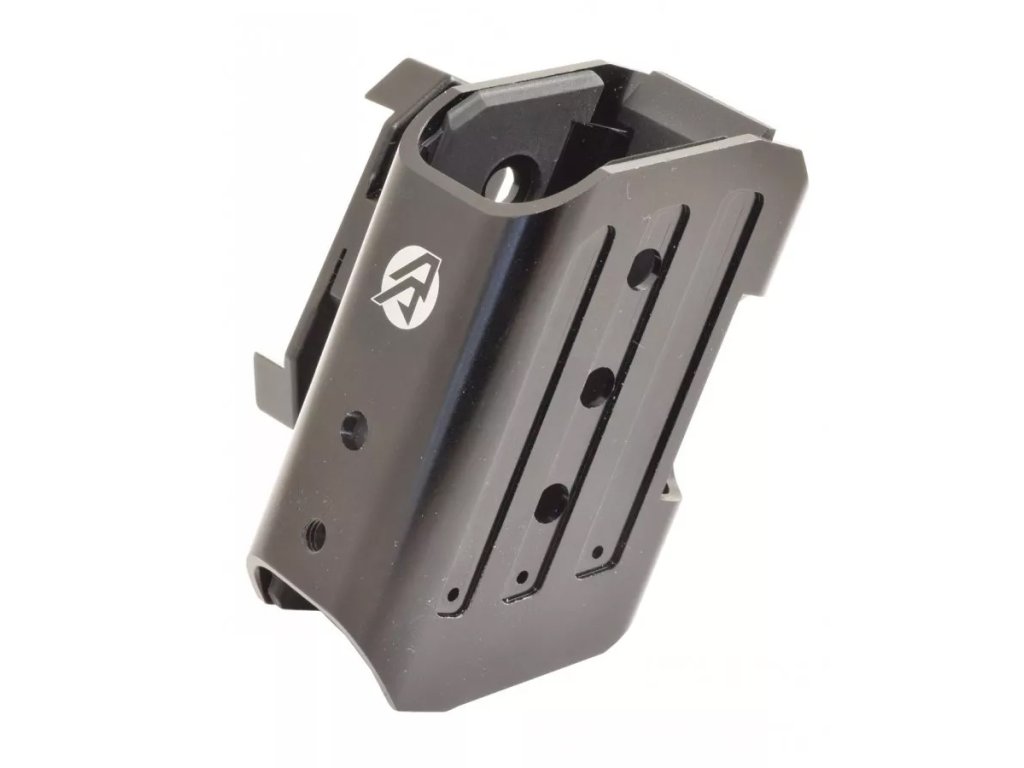 The Alpha-Xi utilizes the same wrap-around spacers (but not identical parts), which align all magazine sizes in the center of the pouch body, while fully enveloping them with polymer, to prevent any possible binding and to create the smoothest draw of the magazine.