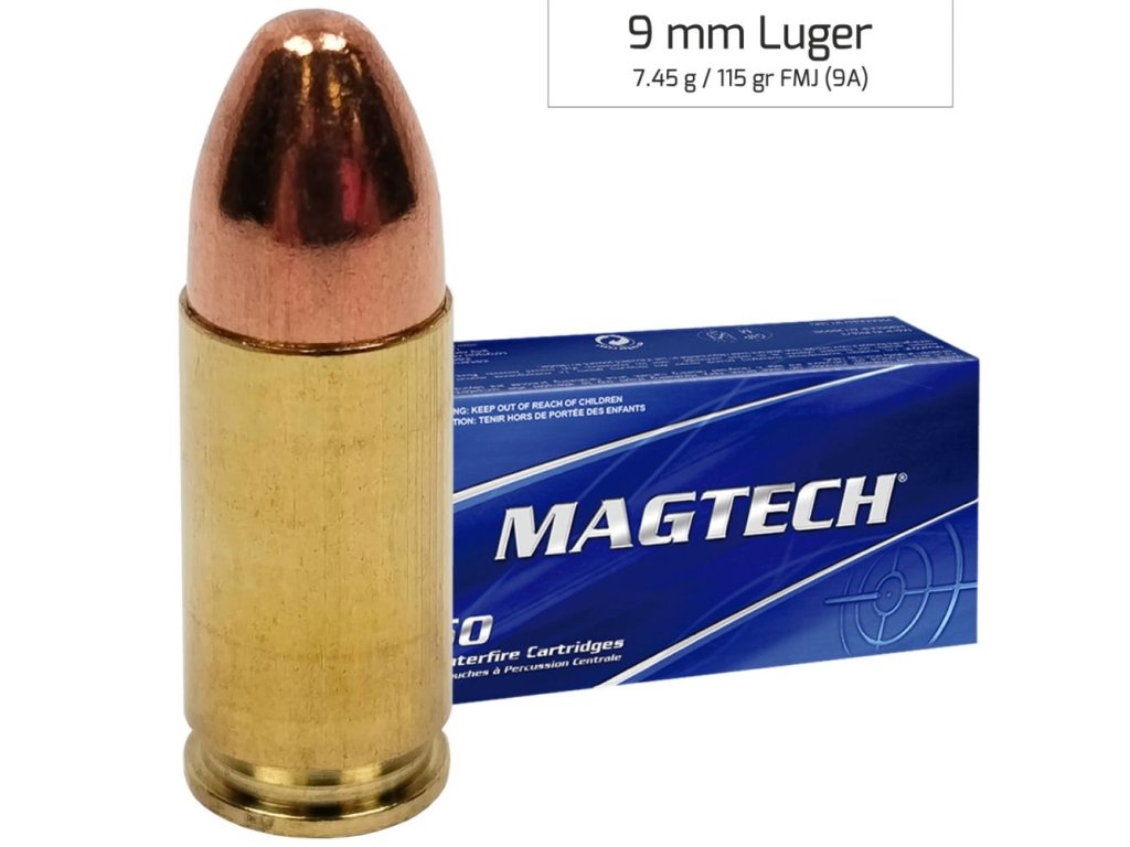 Pistolové náboje Magtech 9 mm Luger / 9x19 s celoplášťovou střelou FMJ (Full Metal Jacket) o hmotnosti 7,45 g / 115 gr jsou ideální volbou pro rekreační a cvičnou střelbu na terč.