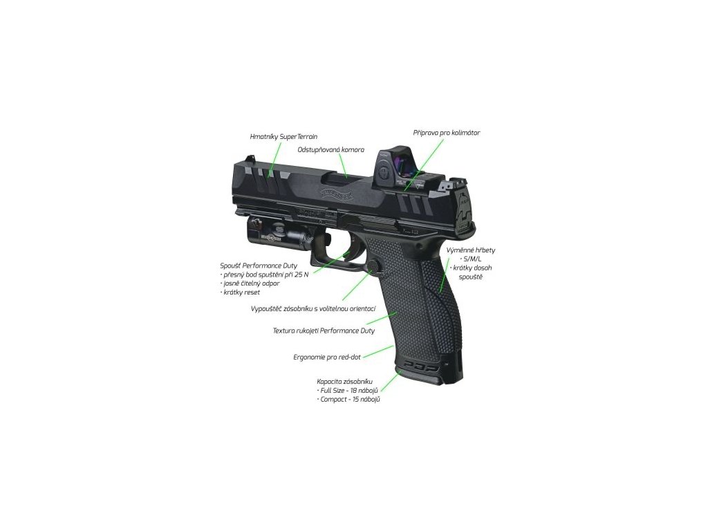 PDP = Performance Duty Pistol je univerzální zbran vhodná pro služební, obranné, tak i sportovní použití.